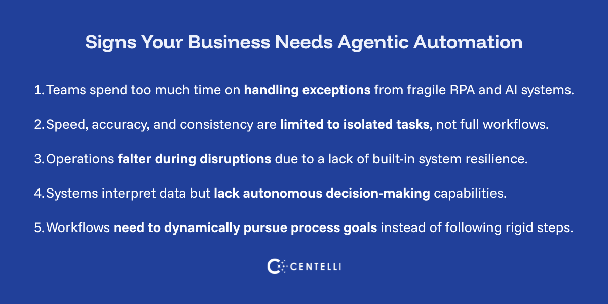 However, agentic automation becomes essential when competitive advantage depends on managing deep complexity, exceptions, or end-to-end orchestration. Consider these scenarios: